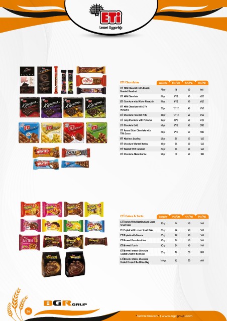 ETİ Chocolates Capacity Pcs/Crt Crt/Pal Pcs/Pal